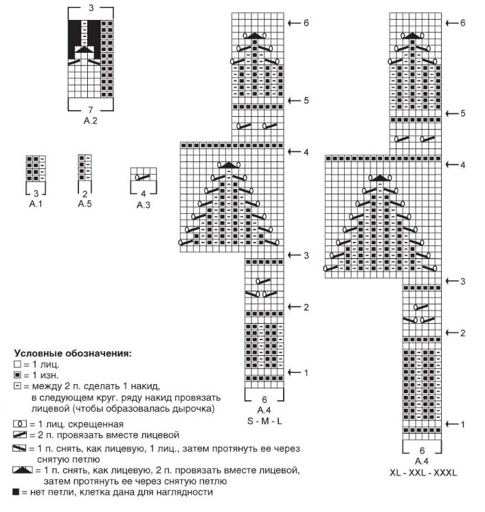 Для вязания по кругу можно использовать технику MAGIC LOOP – в этом случае понадобятся круговые спицы на леске 80 см всех указанных размеров.