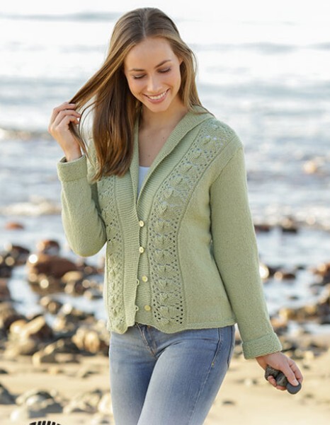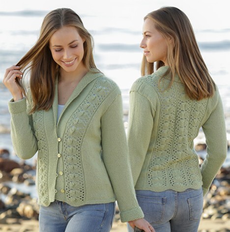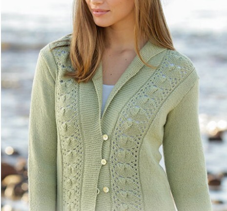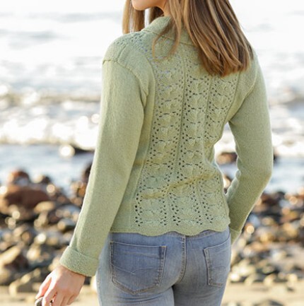 Вязаный жакет с кружевным узором и шалевым воротником из коллекции DROPS Flora